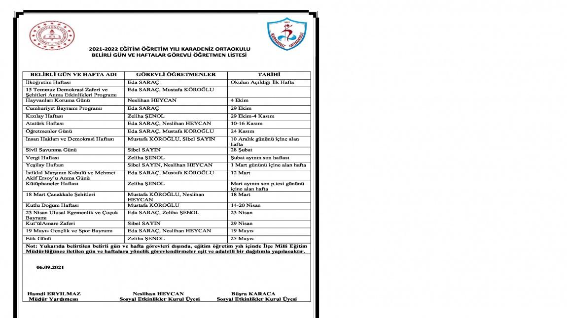 Okulumuzda sosyal etkinlikler çerçevesinde yıl boyunca yapılacak faaliyetlere yönelik planlama takvimi yapılmıştır. Başarılı bir eğitim öğretim yılı olmasını temenni ediyoruz.