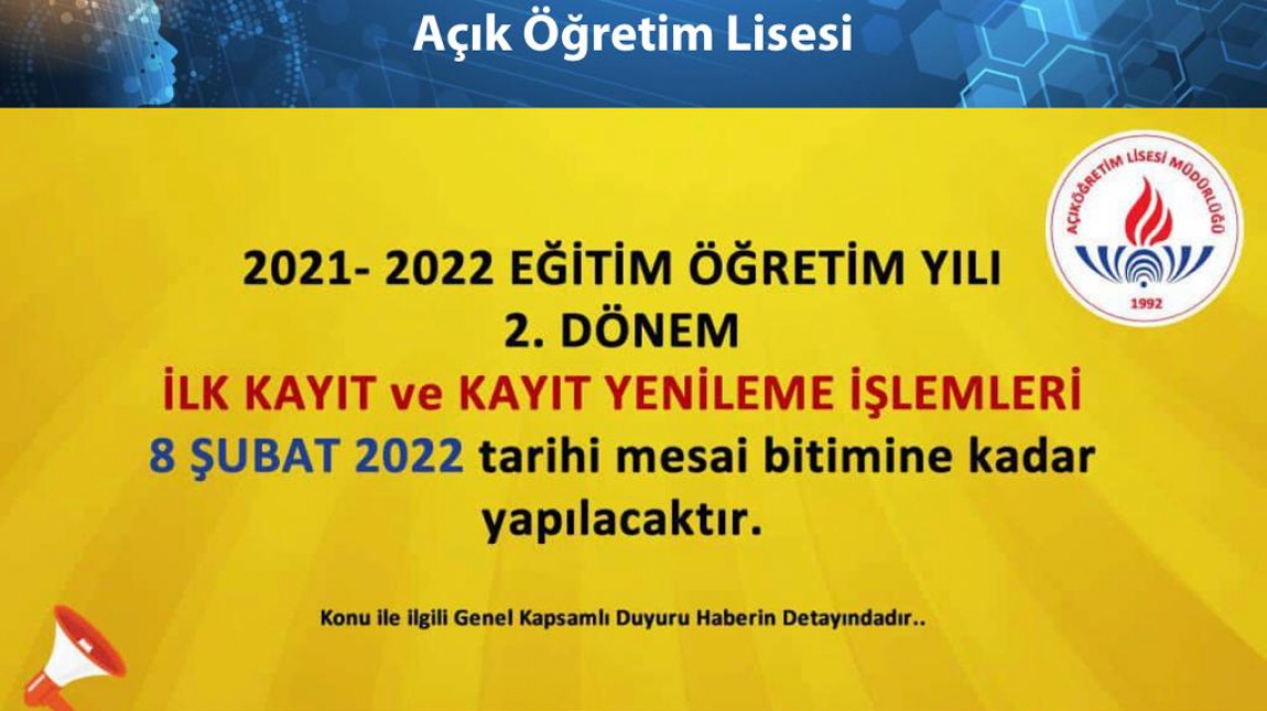 AÇIK ÖĞRETİM İLK KAYIT VE KAYIT YENİLEME İŞLEMLERİ 8 ŞUBAT TARİHİ MESAİ BİTİMİNE KADAR YAPILACAKTIR.