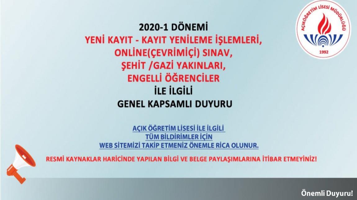 2020-1. DÖNEM İLK ( YENİ) KAYIT - KAYIT YENİLEME İŞLEMLERİ, ÇEVRİMİÇİ (ONLİNE) SINAV, ŞEHİT /GAZİ YAKINLARI, ENGELLİ (ÖZEL EĞİTİM) ÖĞRENCİLER İLE İLGİLİ KAPSAMLI DUYURU