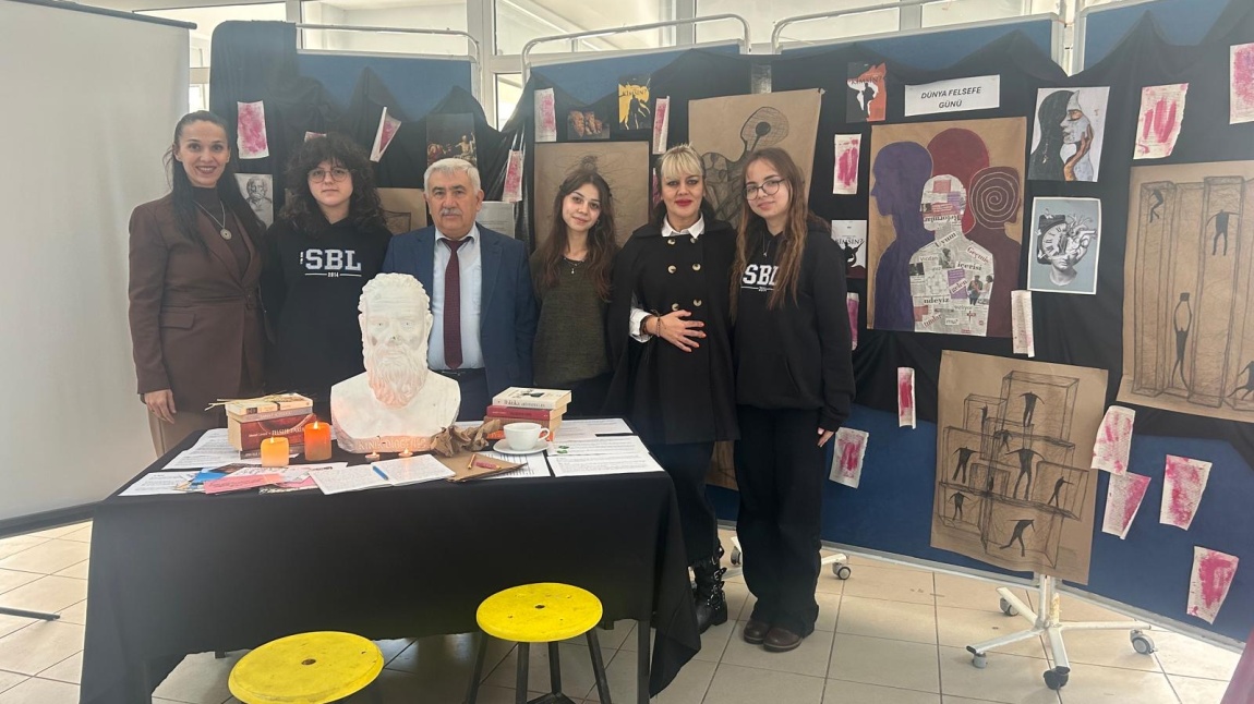 Mehmet Serez Sosyal Bilimler Lisesi öğrencileri gerçekleştirdikleri bir sergiyle 'Dünya Felsefe Gününü’ kutladı. Okulumuz öğrencilerinin Felsefe Kulübü çatısı altında oluşturdukları sergi, öğrenci ve öğretmenlerden büyük beğeni topladı. ‘Felsefi Düşüncenin İnsan Varoluşu İle Etkileşimi’ konulu sergide kitaplar ve müziğin iç içe geçtiği bir kompozisyon oluşturuldu. Sosyal Bilimler ailesi olarak çalışmada gösterdikleri desteklerinden dolayı başta Okul Müdürümüz Mehmet Solak olmak üzere idarecilerimize teşekkür ederiz. Sergi danışmanlığını üstlenen Felsefe Öğretmeni Didem Fatma Özdemir'i, resim çalışmaları için 11 C sınıfı öğrencisi Aysu Defne Çolak’ı, metin çalışmalarını tasarlayan 11 A sınıfından Burçin Kahraman’ı ve Bennu Naz Perver’i kutlar, başarılarının devamını dileriz!