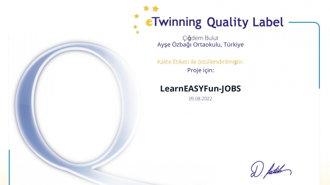Okulumuz İngilizce öğretmeni Çiğdem Bulut ve 2/A sınıfı öğrencilerinin yer aldığı Learn Easy Fun Jobs projesi tamamlanmış, öğretmenimiz Ulusal Kalite Etiketini almaya hak kazanmışlardır.