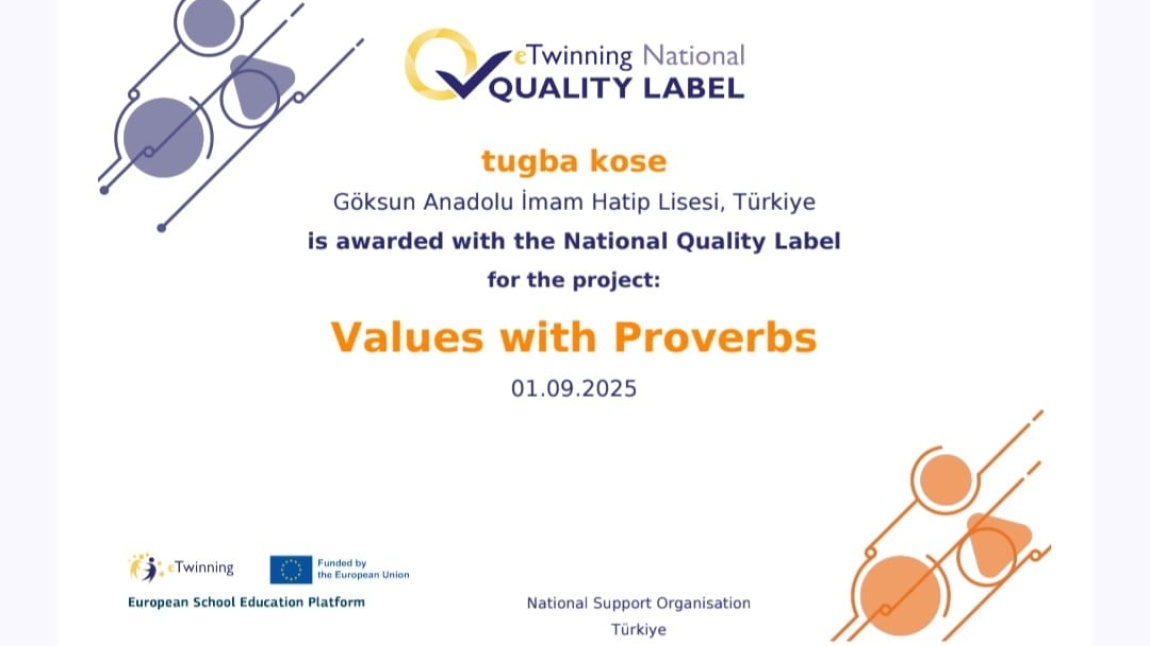 2024-2025 Eğitim ve Öğretim yılında, İngilizce Öğretmenimiz Tuğba KÖSE koordinesinde yürütülen "Values with Proverbs" adlı uluslararası e-Twinning projesi Ulusal Kalite Etiketi almaya hak kazandı. Öğretmenimizi ve öğrencilerimizi tebrik eder, başarılarının devamını dileriz.
