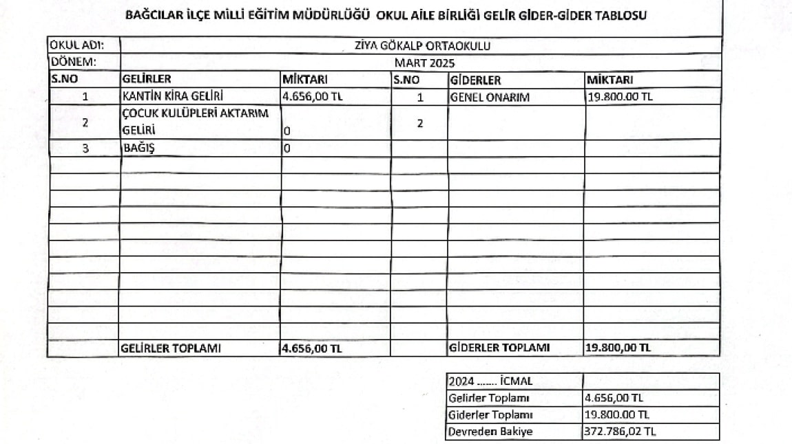 Mart 2025 Yılı Okul Aile Birliği Gelir Gider Tablosu