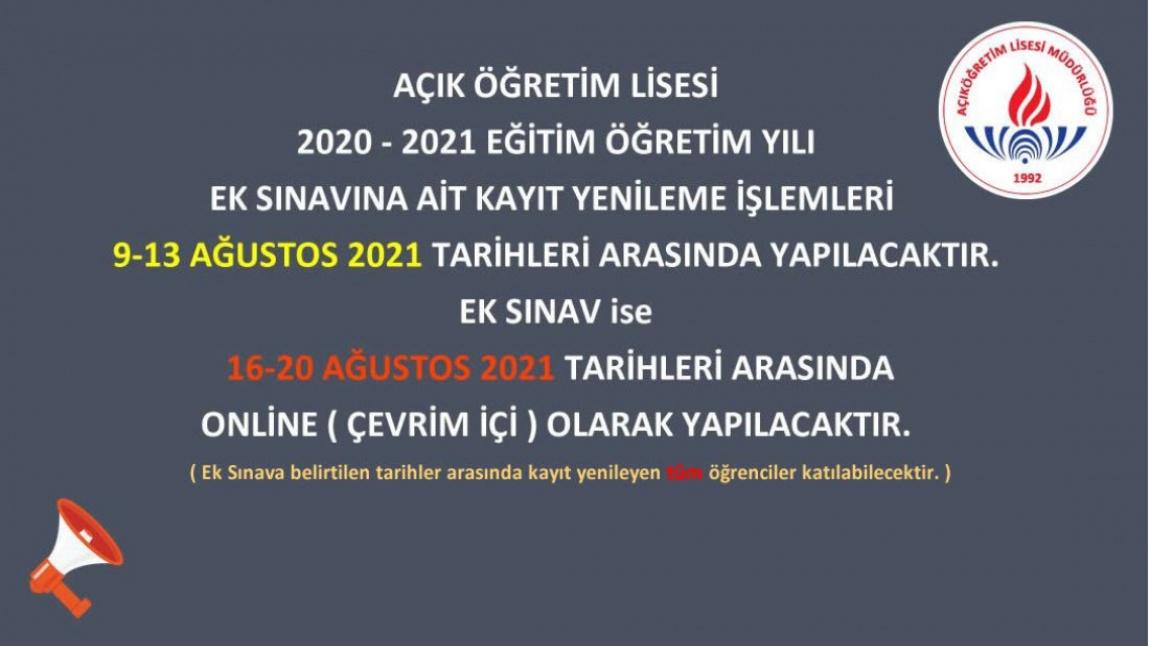 AÇIK ÖĞRETİM LİSESİ 2020 - 2021 EĞİTİM ÖĞRETİM YILI EK SINAVINA AİT KAYIT YENİLEME İŞLEMLERİ 9-13 AĞUSTOS 2021 TARİHLERİ ARASINDA YAPILACAKTIR.