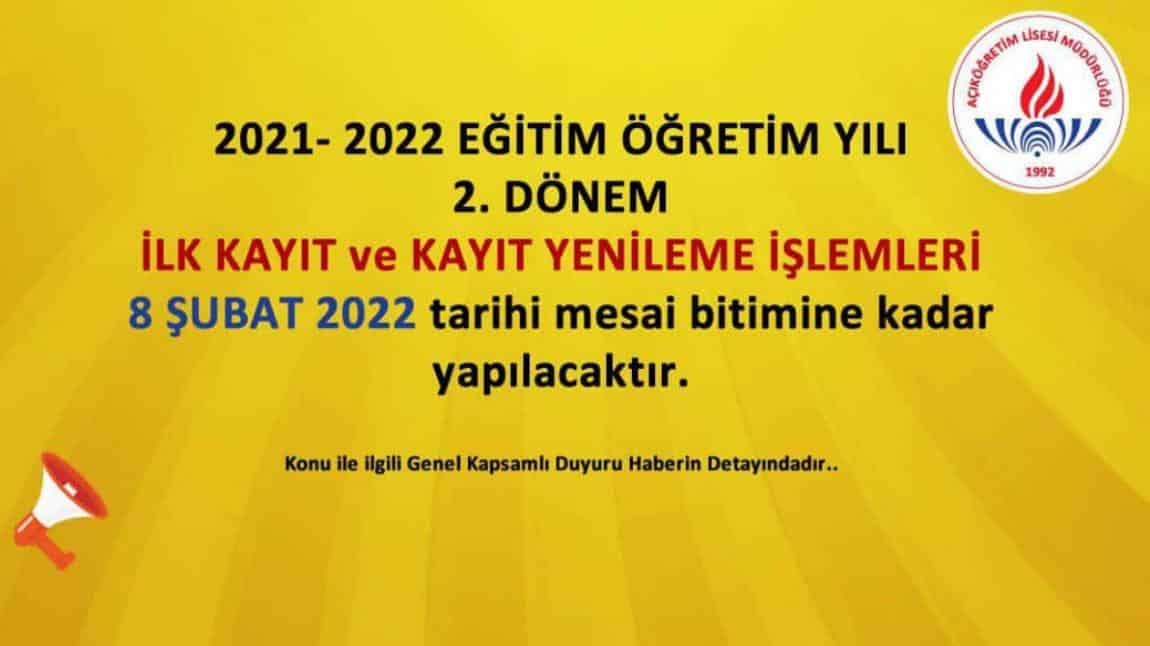 1) Açık Öğretim Lisesi 2021-2 Dönemi ilk kayıt ve kayıt yenileme işlemleri 27 ARALIK 2021 - 8 ŞUBAT 2022 günü mesai bitiminde sona erecektir.