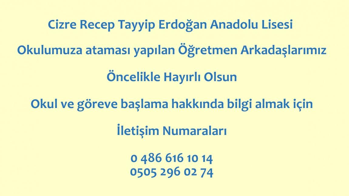AdresKONAK MAH. 1396 SK. CİZRE RECEP TAYYİP ERDOĞAN ANADOLU LİSESİ SİTESİ CİZRE RECEP TAYYİP ERDOĞAN ANADOLU LİSESİ BLOK NO 13 CİZRE / ŞIRNAK